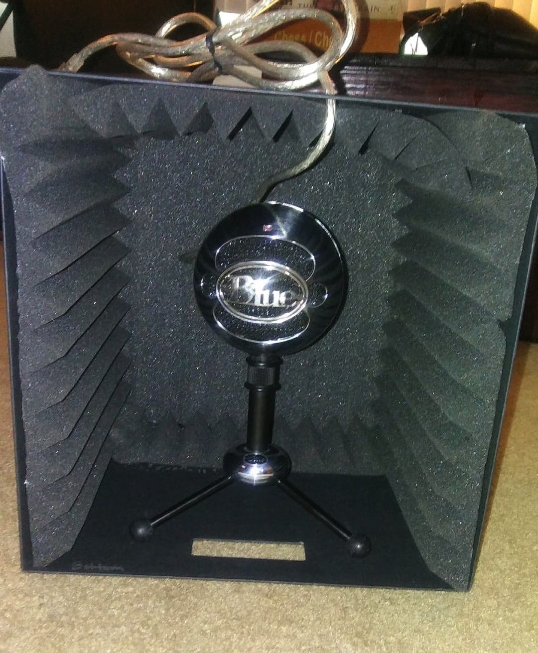 Put your mic in the box and the filter in front and viola sound proof booth in a box! (I removed the filter so you can see how the mic fits in the box. I then mounted the filter to the desk in front of the whole contraption)